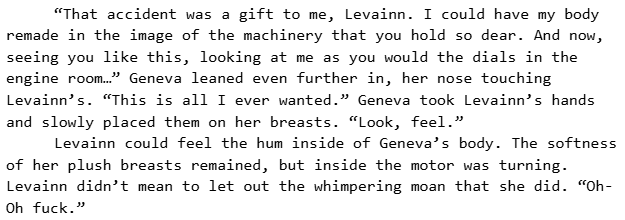 Current project: The Murder of Sandalphon - Yuri about a girl with airship autism and her boss that only has half her body left. Contains elements of body horror, obsession, general toxicity